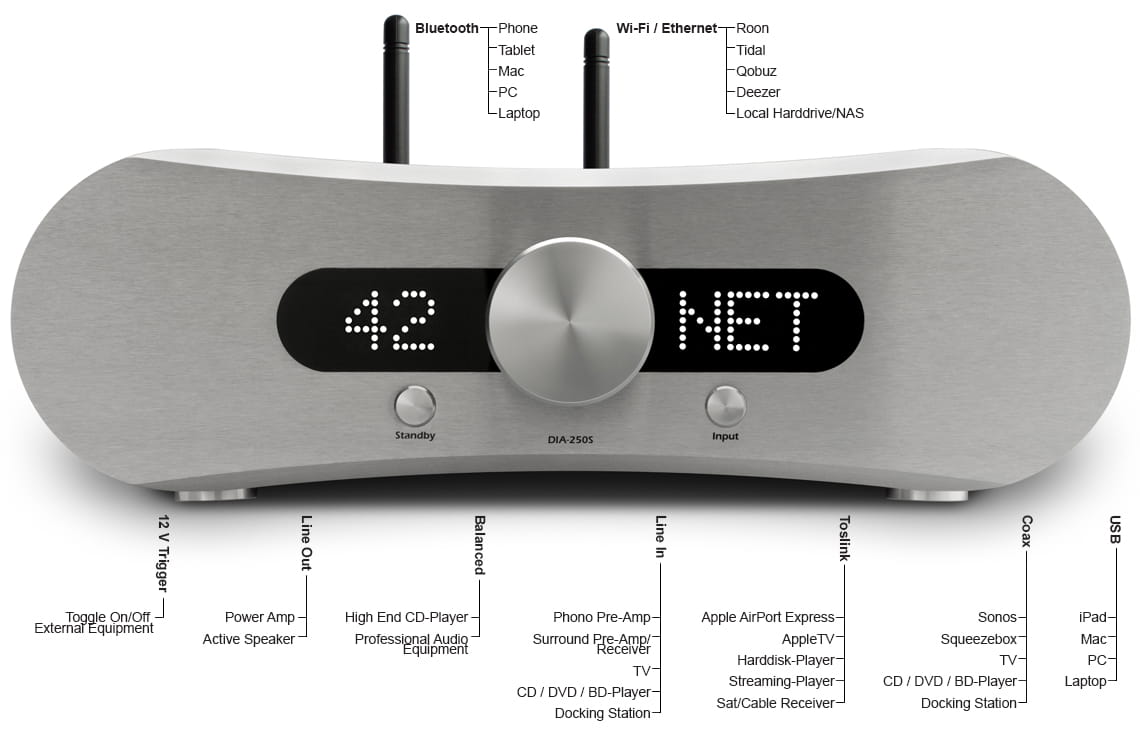 Projektując ten wzmacniacz, zwracaliśmy uwagę na wszechstronność i łączność. DIA-250S oferuje nie tylko szeroką gamę wejść cyfrowych i analogowych, ale także wyjścia liniowe, sygnał wyzwalający dla zewnętrznych wzmacniaczy mocy oraz konfigurowalne wejście kina domowego. Wejście HT może przekształcić wzmacniacz w wzmacniacz mocy o stałym poziomie do użytku w konfiguracji surround, bez uszczerbku dla jakości dźwięku.