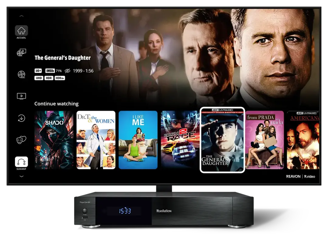 PlayerOne 8K wyposażono w aplikację R_video — bezpłatne centrum multimedialne, oferujące rozbudowany i nowoczesny interfejs do przeglądania filmów oraz seriali. R_video skanuje pliki wideo zapisane na lokalnym dysku podłączonym do PlayerOne 8K lub na serwerze NAS w sieci lokalnej. Następnie automatycznie pobiera okładki, grafiki tła oraz szczegółowe informacje o filmach, takie jak obsada, reżyser, data premiery, oceny i inne dane.