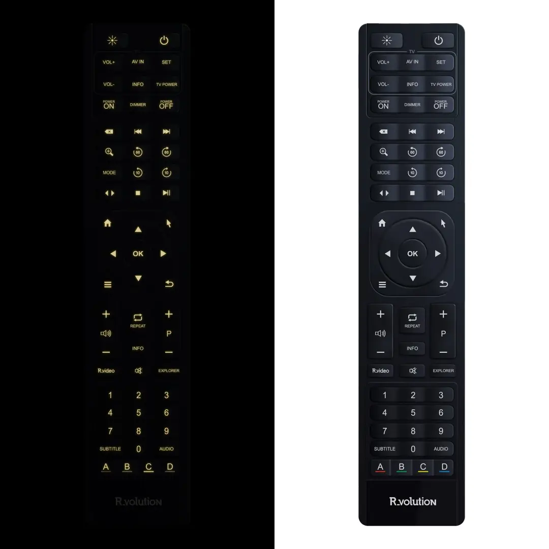 Odtwarzacz multimedialny R_volution PlayerOne 8K dostarczany jest z podświetlanym pilotem na podczerwień (IR).