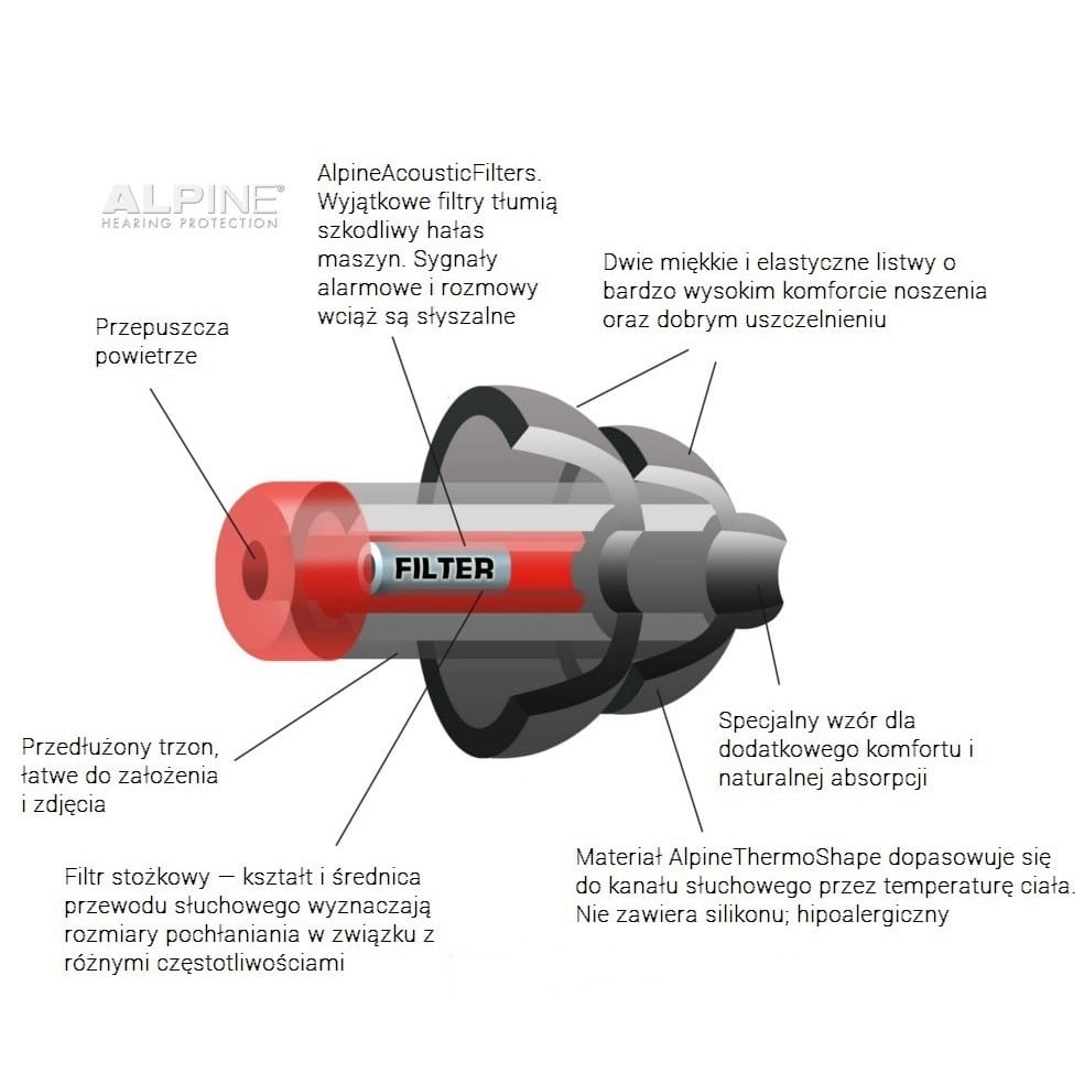 Stopery do uszu MotoSafe PRO Alpine nie powodują nieprzyjemnego nacisku na kanał słuchowy. Wykonane są z niezwykle miękkiego, wolnego od silikonu, termoplastycznego materiału. Wykorzystuje on ciepło ciała i w przeciągu kilku minut idealnie dopasowuje się do kształtu kanału słuchowego. Dodatkowo stopery w nowej wersji mają miękki filtr akustyczny, co zwiększa komfort ich użytkowania pod kaskiem. Ponadto wkładki przeciwhałasowe MotoSafe PRO posiadają otwarty filtr akustyczny, który niweluje uczucie izolacji i pozwala uchu oddychać. Nawet po wielogodzinnym używaniu tych zatyczek, nie występuje nieprzyjemne "klejenie" w kanale słuchowym i nie ma ryzyka nadmiernego wytwarzania woskowiny.