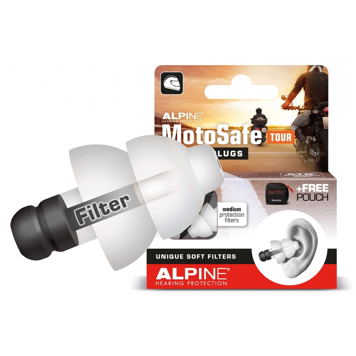 Zatyczki ALPINE MotoSafe Tour powstały w odpowiedzi na zapotrzebowanie na system ochrony słuchu, który przeciwdziała zmęczeniu spowodowanemu długą jazdą. Lubisz długie podróże motocyklem, a nie chcesz być narażony na niepotrzebne zmęczenie? Długa jazda motocyklem może powodować charakterystyczny pisk w uszach. Specjalny filtr Alpine Acoustic Filter pomaga zniwelować ten efekt, przy czym pozostawia odgłosy ruchu drogowego czy nawigacji dostatecznie słyszalne. Do zestawu dołączony jest materiałowy pokrowiec, w którym bezpiecznie i łatwo można przechowywać zatyczki.