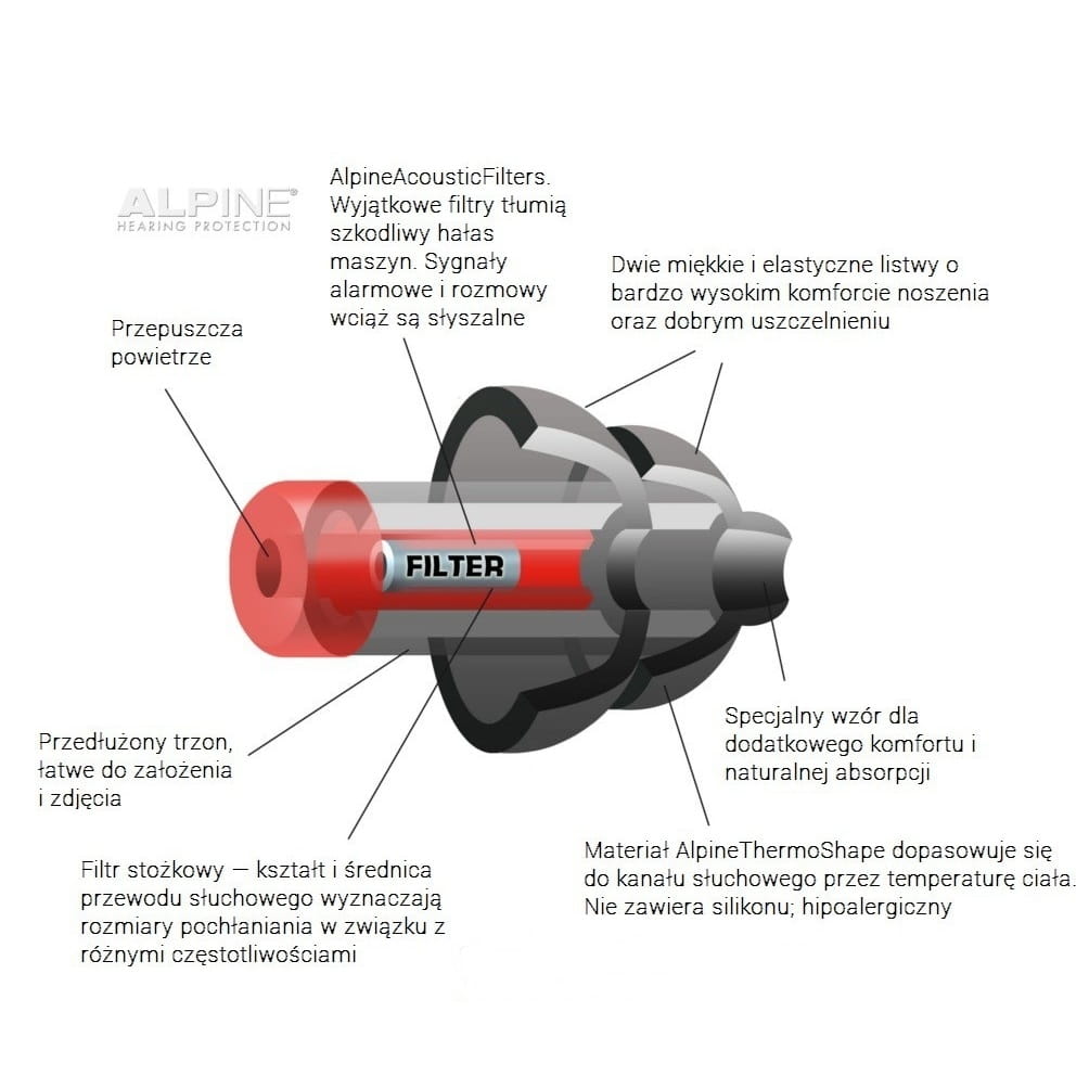 Ponadto wkładki przeciwhałasowe MotoSafe Tour posiadają otwarty filtr akustyczny, który niweluje uczucie izolacji i pozwala uchu oddychać. Nawet po wielogodzinnym używaniu tych zatyczek, nie występuje nieprzyjemne "klejenie" w kanale słuchowym i nie ma ryzyka nadmiernego wytwarzanie woskowiny. Co wyróżnia te zatyczki od innych dostępnych na rynku? Stopery do uszu MotoSafe Tour Alpine nie powodują nieprzyjemnego nacisku na kanał słuchowy. Wykonane są z niezwykle miękkiego, wolnego od silikonu, termoplastycznego materiału. Wykorzystuje on ciepło ciała i w przeciągu kilku minut idealnie dopasowuje się do kształtu kanału słuchowego. Dodatkowo stopery w nowej wersji mają miękki filtr akustyczny, co zwiększa komfort ich użytkowania pod kaskiem.