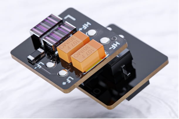 Zanurz się w każdej uderzającej nucie Twojej muzyki dzięki precyzyjnej zwrotnicy. FA19 wykorzystuje kondensatory foliowe klasy audiofilskiej jako elektroniczne komponenty zwrotnicy, które charakteryzują się wyjątkową precyzją. Podczas gdy typowe rezystory stosowane w zwrotnicach mają tolerancję błędu około 1%, rezystory FA19 mają imponująco niską tolerancję błędu wynoszącą 0,1%. W ten sposób, w porównaniu do zwykłych kondensatorów ceramicznych, FA19 nie tylko precyzyjniej działa ze zwrotnicą, ale także charakteryzuje się zwiększoną rozdzielczością wysokich częstotliwości bez poświęcania finezji tonalnej.