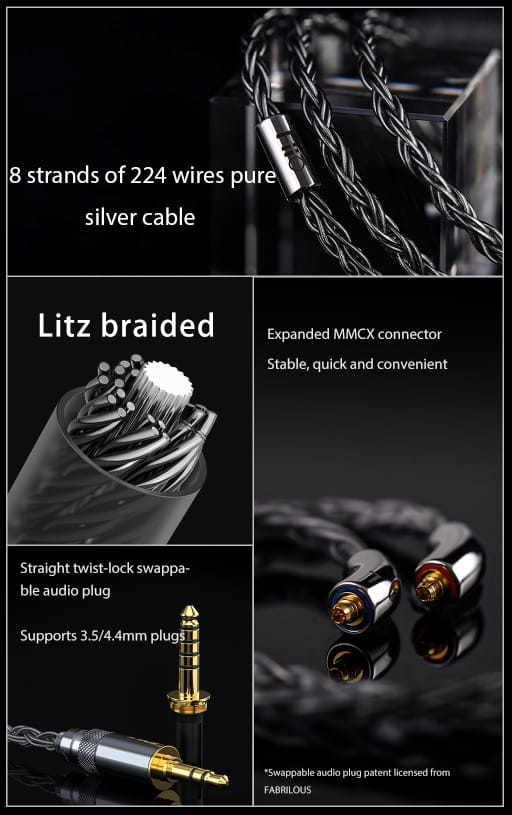 FA19 jest standardowo wyposażony w kabel z czystego srebra o wysokiej czystości, składający się z 8 żył po 28 przewodów każdy, co daje łącznie 224 przewody. Każdy pojedynczy przewód jest niezależnie izolowany, a kabel jest pleciony przy użyciu struktury Litz. Osłona kabla jest wykonana z importowanego, przezroczystego, przyjaznego dla środowiska TPU, co poprawia wygląd kabla. Ponadto ten materiał TPU skutecznie zapobiega żółknięciu z powodu długotrwałego użytkowania i usztywnieniu kabla z powodu stosowania w środowiskach o niskiej temperaturze.