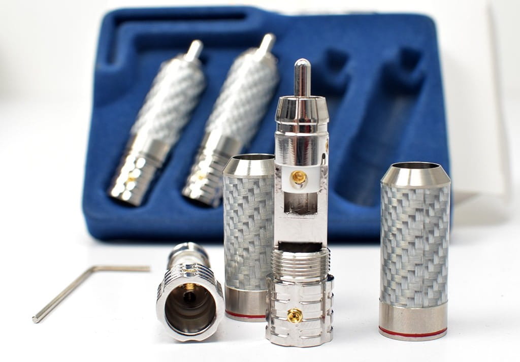 Najwyższej jakości wtyki RCA do konfekcji kabla Viborg VR108R. Elementy stykowe wykonane z czystej miedzi pokryte warstwą rodu.