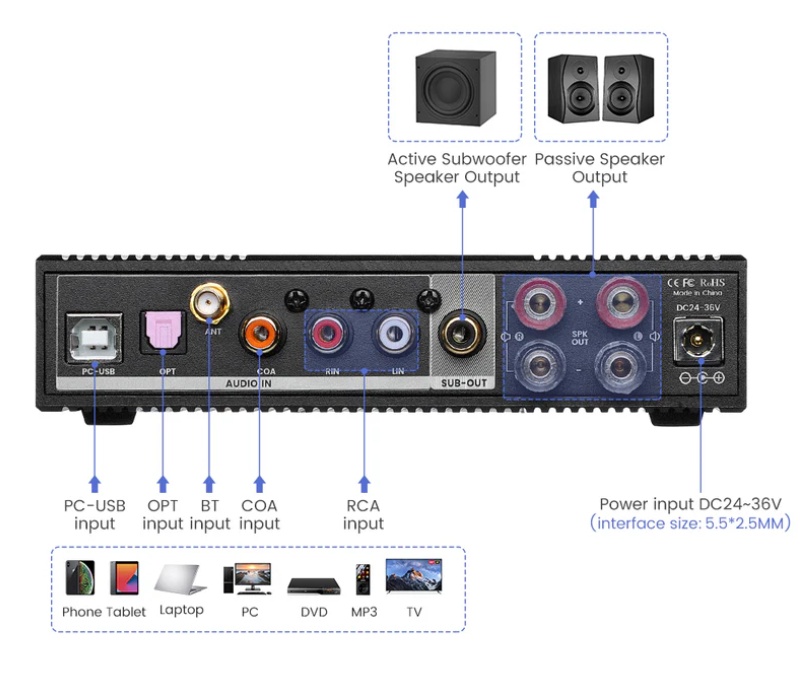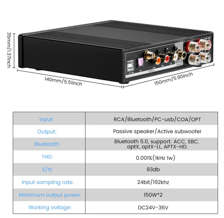 Wzmacniacz z Bluetooth 5.0 i APTX-LL umożliwia strumieniowe przesyłanie muzyki i dźwięku stereo w czystym brzmieniu.
