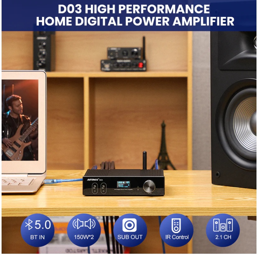 AIYIMA D03 zintegrowany wzmacniacz o niewielkich rozmiarach. Ulepsz swoje głośniki i subwoofer za pomocą 150W@4ohm dwukanałowego wzmacniacza z możliwością strumieniowego przesyłania muzyki.