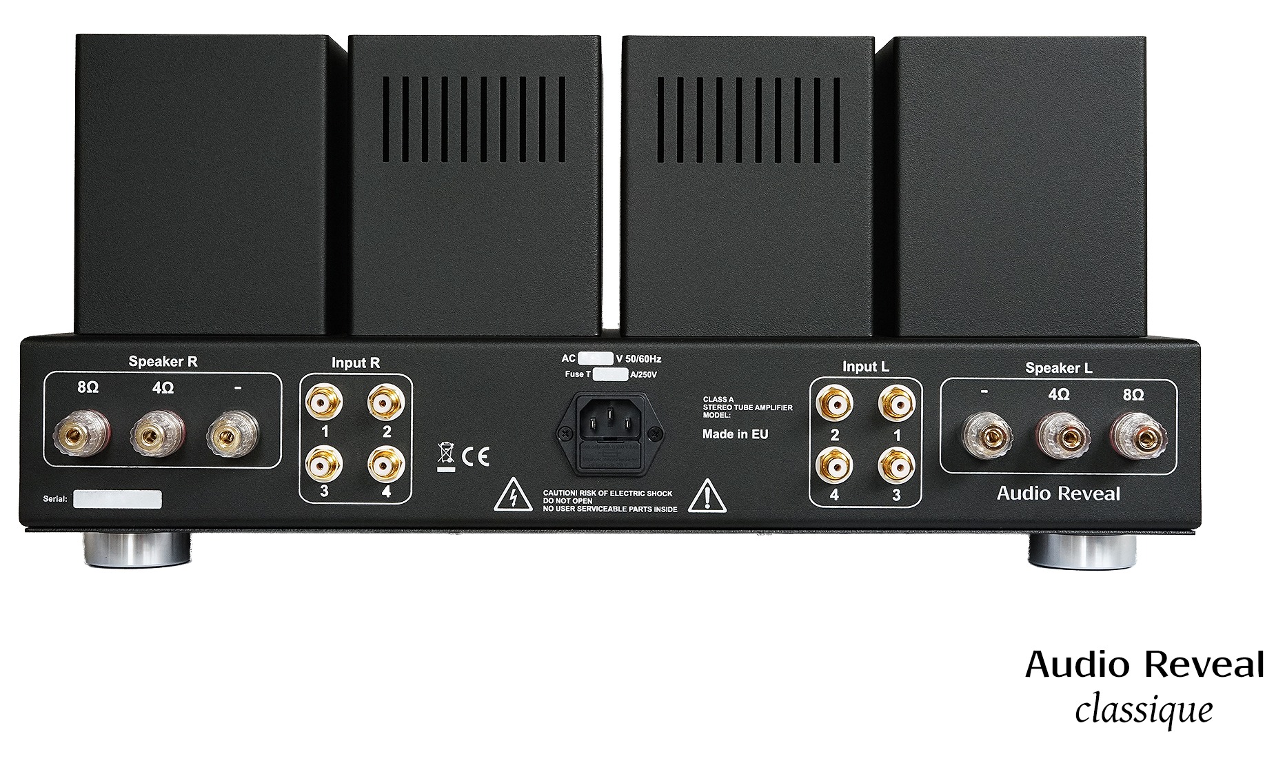 Wzmacniacz Audio Reveal Classique jest konstrukcją dual mono, z osobnymi sekcjami zasilania oraz transformatorami sieciowymi do obu kanałów. W sekcji przedwzmacniacza znajdują się lampy 12AT7 i 12AU7, a lampą końcową jest pojedyncza trioda 300B. Napięcie anodowe lamp jest dodatkowo filtrowane poprzez dławiki w układzie LC - dławiki znajdują się pod dodatkowymi metalowymi kubkami.